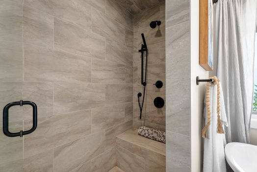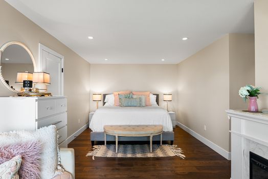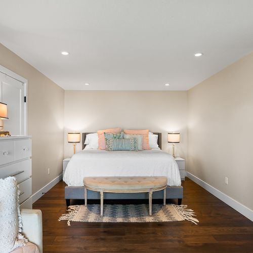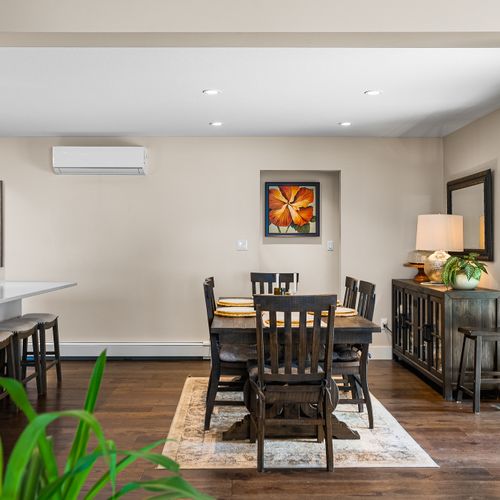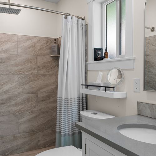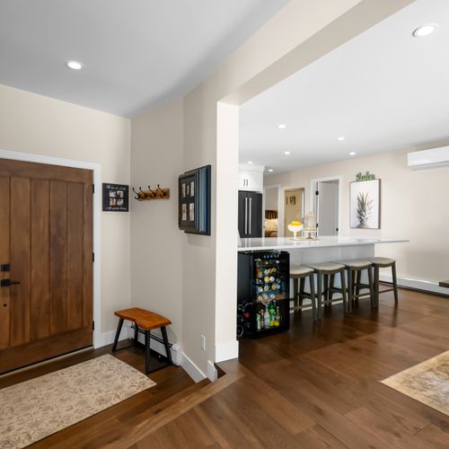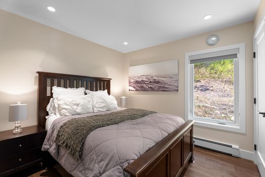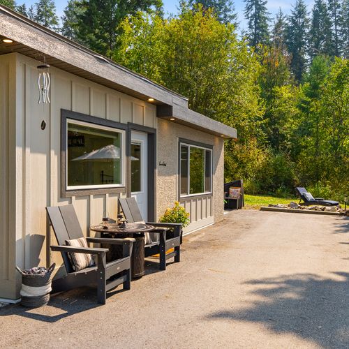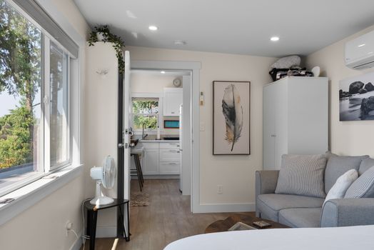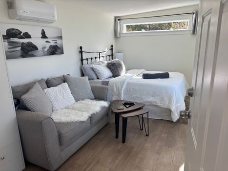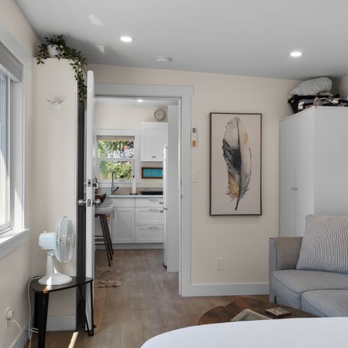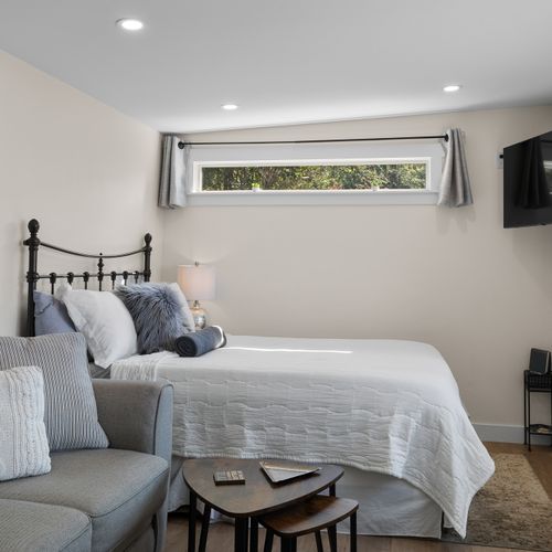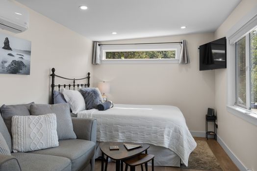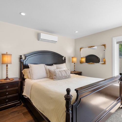 Inside the main house, you’ll find three beautifully appointed bedrooms and two spa-inspired bathrooms. Hardwood floors flow throughout, and the master suite is a retreat in itself, featuring a plush California King bed, a cozy gas fireplace, and a luxurious ensuite with a deep soaker tub and walk-in tile shower. Two additional bedrooms each feature queen beds, offering comfort and style for family or guests.