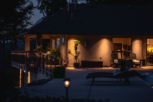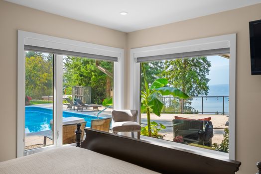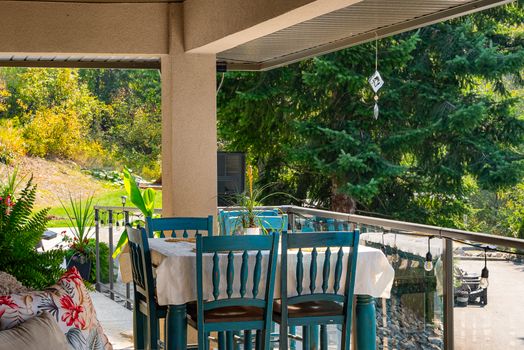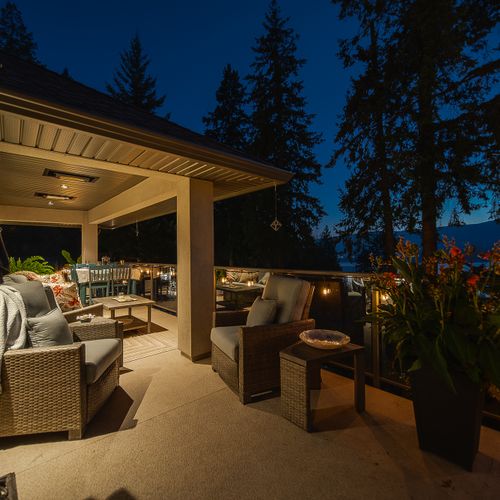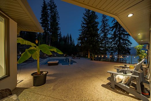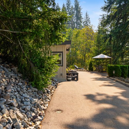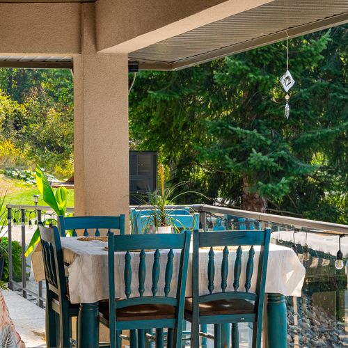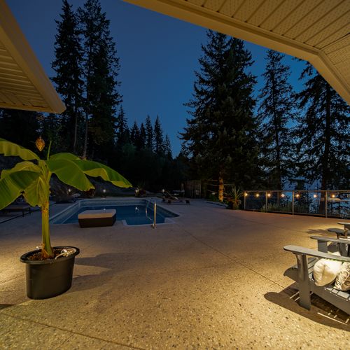 The patio also directly leads to the heated saltwater pool and private hot tub, where you can spend long summer days basking in the sun or quiet evenings under the stars. Surrounded by trees and open skies, the property offers true serenity—no neighbours in sight, only the stillness of nature and the beauty of Shuswap.
