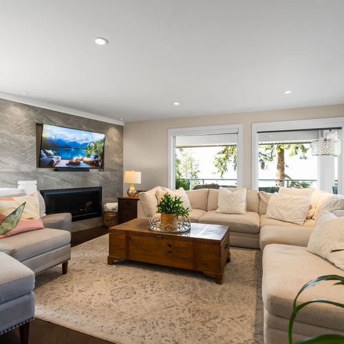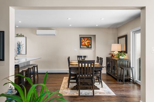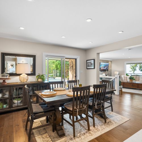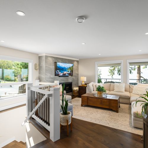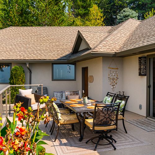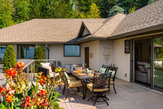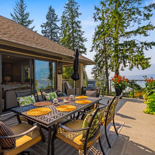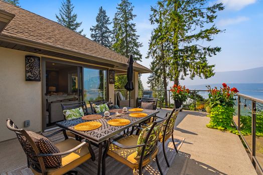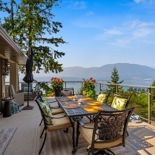 From the moment you arrive, the panoramic lake views and breathtaking sunsets will captivate you. The front patio facing the lake is accessible from the walk up stairs to the front door. Seamlessly blending indoor and outdoor living, the space flows easily throughout. Here, you’ll find generous lounge seating and a dining area perfect for alfresco meals with the lake as your backdrop.