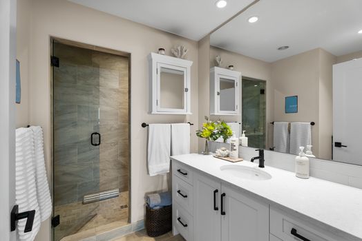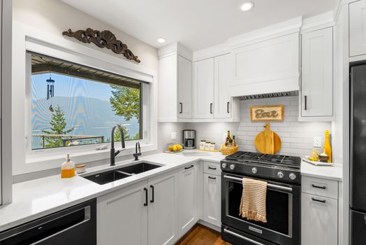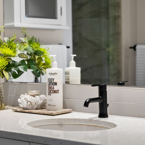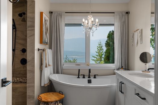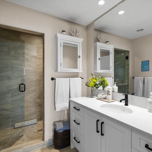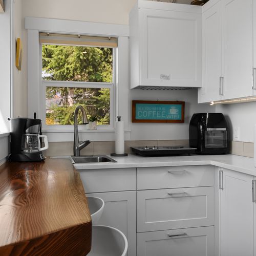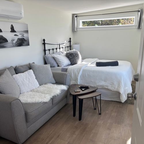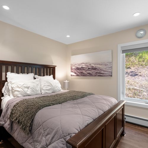 For larger groups, Raven’s Retreat also includes a charming Coach House—a private space for two guests with its own fully equipped kitchen, rainfall walk-in shower, heated tile floors, double sinks, and a cozy sitting area framing more spectacular lake views. Thoughtfully designed and full of character, it’s an ideal hideaway for extended family or friends seeking extra privacy.