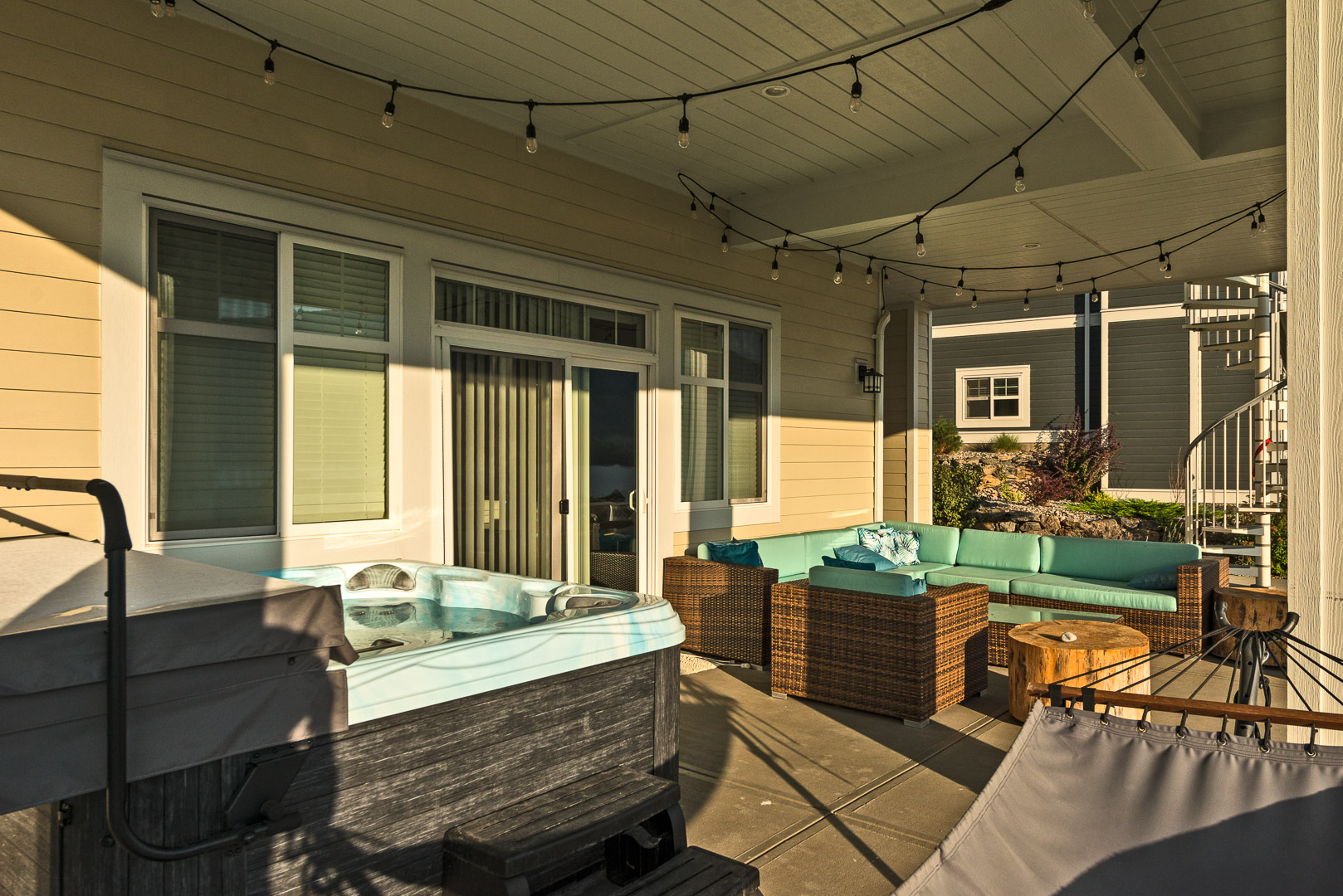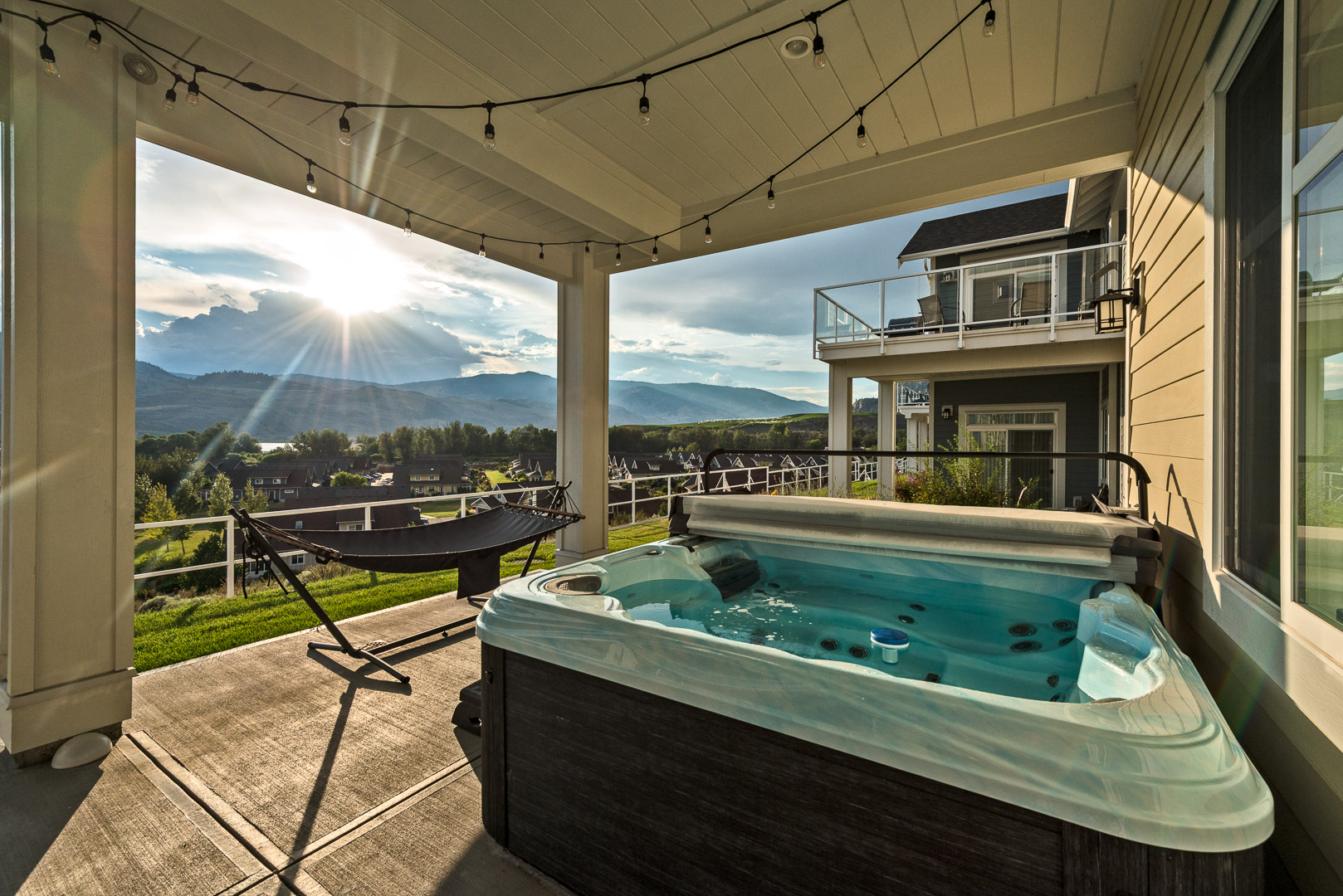 ✨ Soak in the private hot tub under string lights ✨ with the lake and mountain silhouette as your backdrop 🌙.